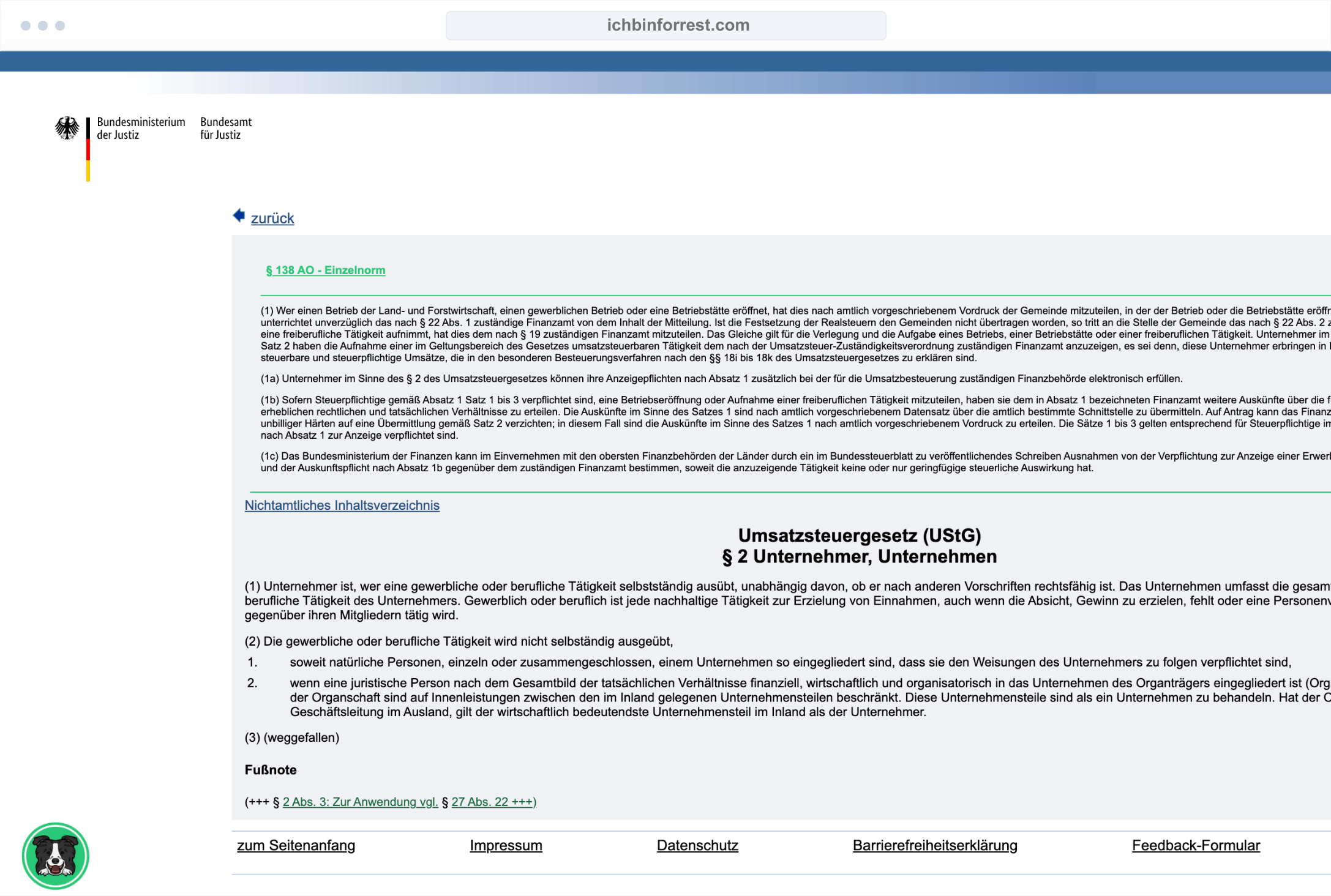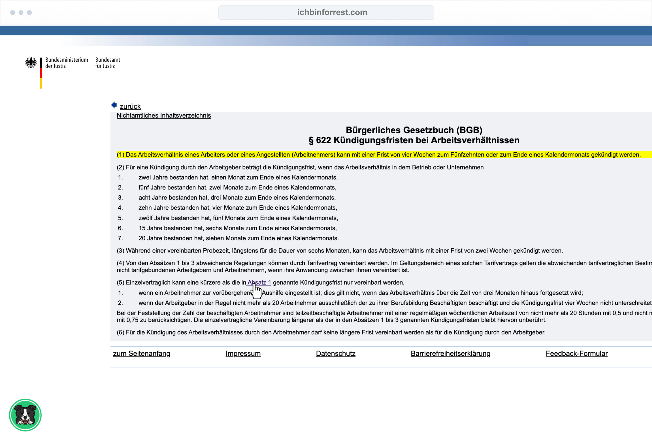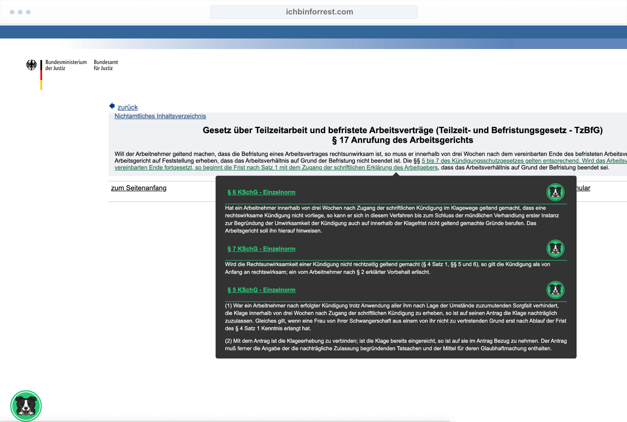 Forrest ist eine Browser-Extension für die Internetseite www.gesetze-im-internet.de. "Offline" ist Forrest übrigens ein siebenjähriger, lebensfroher Border Collie und die Inspiration für vieles.